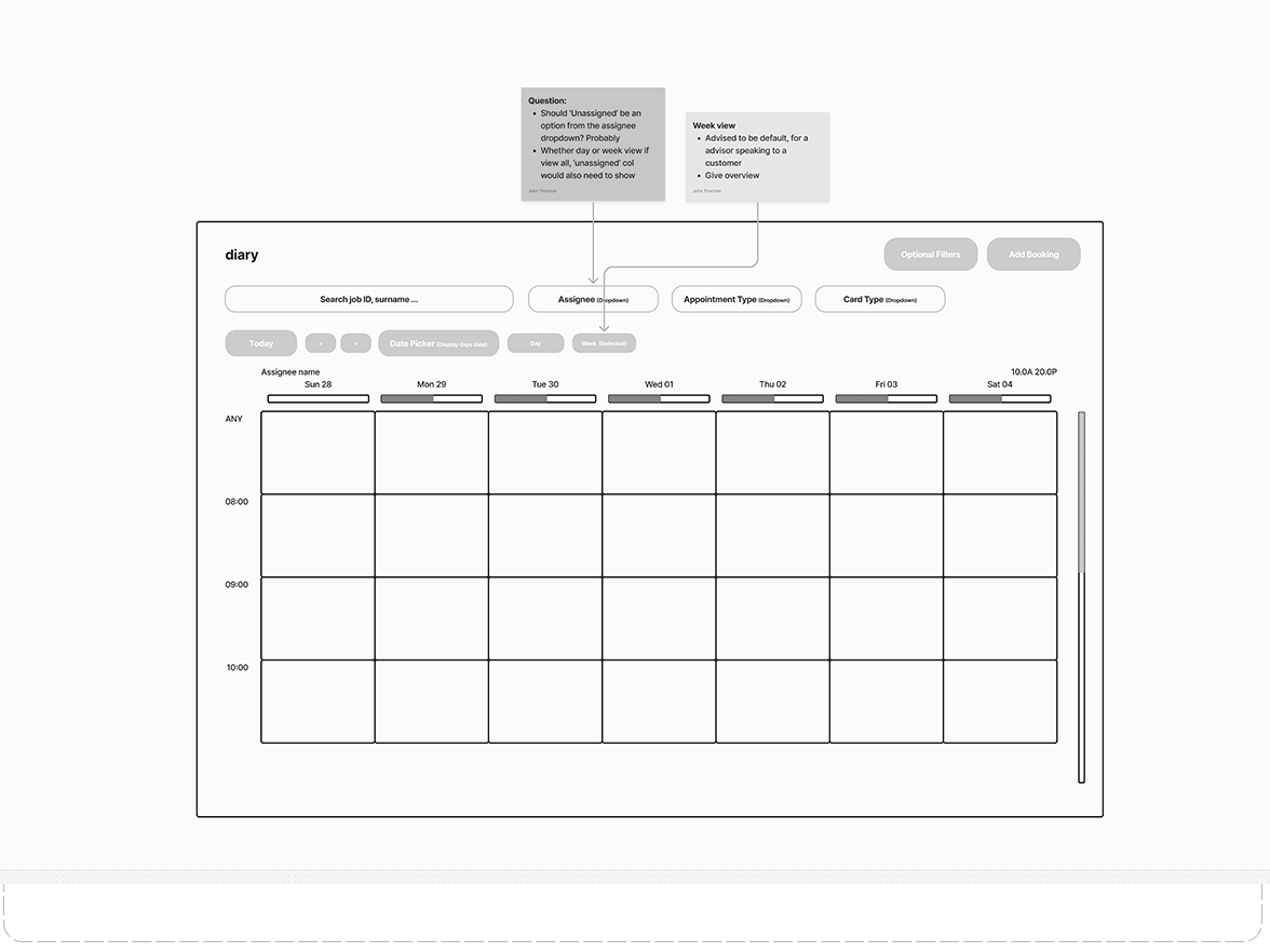 The current software lacks a user-centric diary and appointment feature, originally developed without input from a UX designer. This deficiency has led to low user satisfaction and a reliance on manual processes to manage these critical tasks of scheduling enquiries and orders.